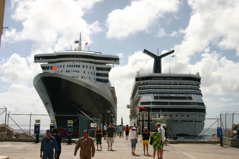Queen Mary 2 and Carnival Victory docked in Basseterre, Saint Kitts